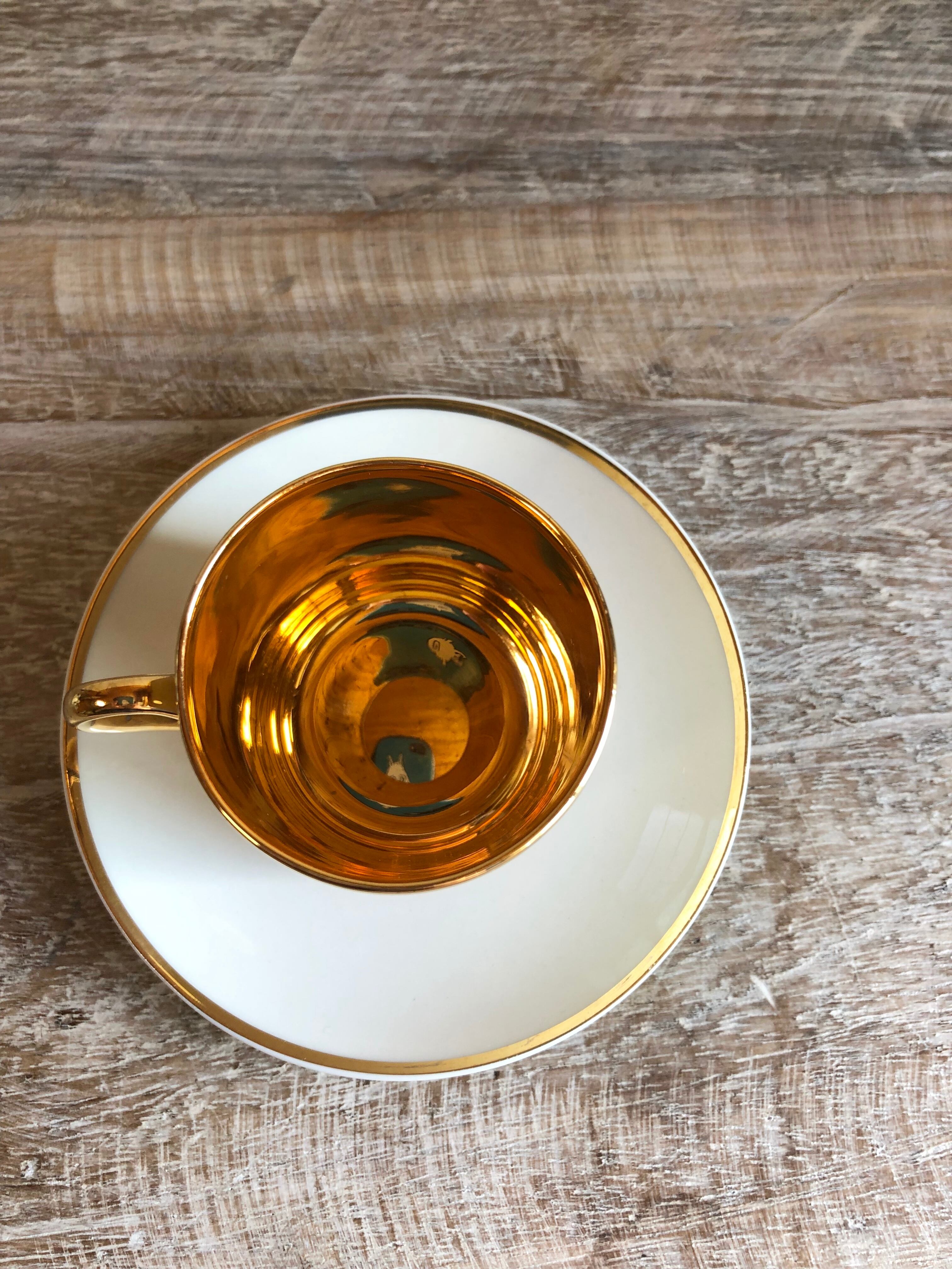 取っ手と飲み口、カップ内に至っては全てゴールドでピカピカ、ソーサーの縁にもゴールドのラインが入っています。