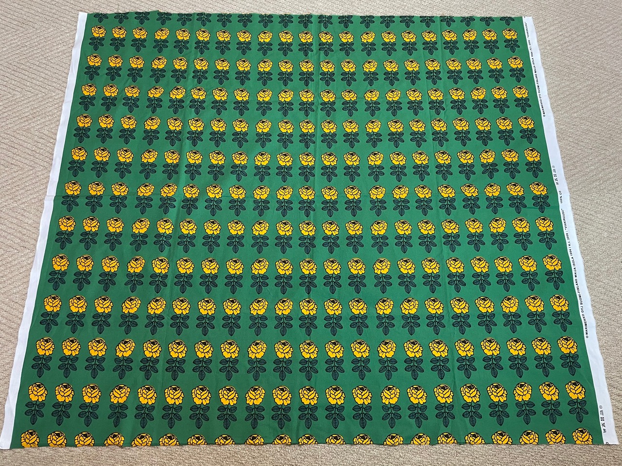 マリメッコ、「ヴィヒキルース」グリーン×イエローの生地です。